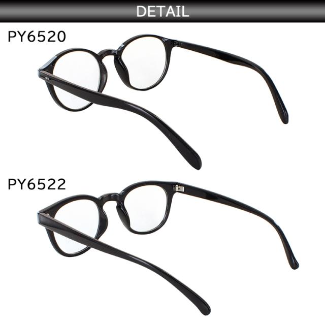 | ●フレームカラー PY6520-1 ブラック PY6520-2 イエローデミ PY6520-3 クリア PY6520-4 ブラウン PY6522-1 ブラック PY6522-2 ブラウン PY6522-3 ブラウンデミ ●レンズカラー(全色共通) クリア | ●素材 フレーム:プラスチック(塗装) テンプル:プラスチック(塗装) レンズ:プラスチック(コーティング) ●仕様 UVカット99%以上 |