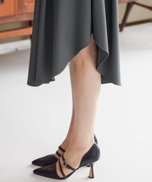 タックの入ったイレギュラーな裾デザインのスカートが美しいドレープ感を生み出し、