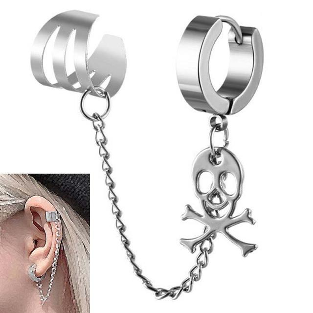 シンプルなステンレス製のフープピアスと3連風のメタル製のイヤーカフをチェーンでつなげリングピアスにスカルと骨のチャームが揺れる存在感のあるチェーンピアスイヤーカフ。