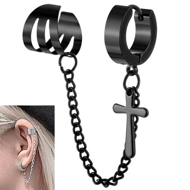 シンプルなステンレス製のフープピアスと3連風のメタル製のイヤーカフをチェーンでつなげリングピアスに十字架のチャームが揺れる存在感のあるチェーンピアスイヤーカフ。