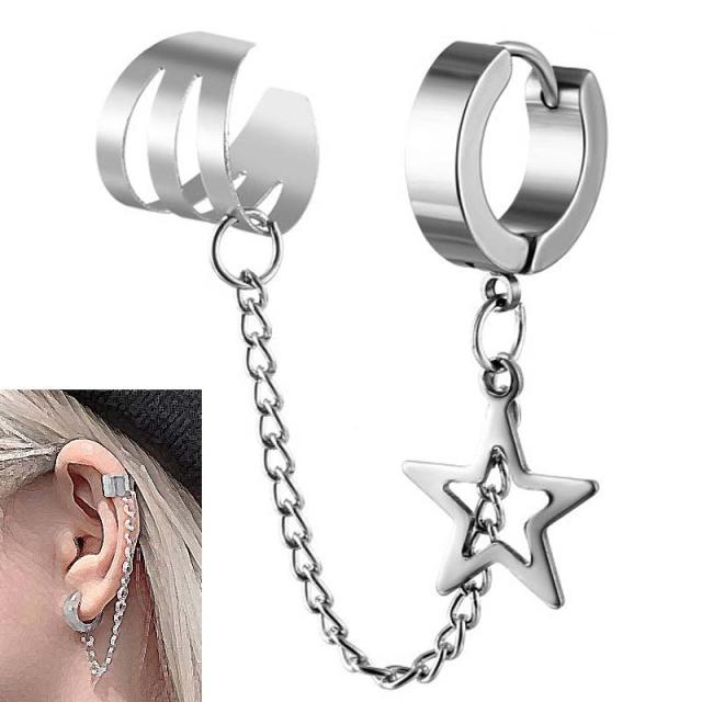 シンプルなステンレス製のフープピアスと3連風のメタル製のイヤーカフをチェーンでつなげリングピアスに星のチャームが揺れる存在感のあるチェーンピアスイヤーカフ。