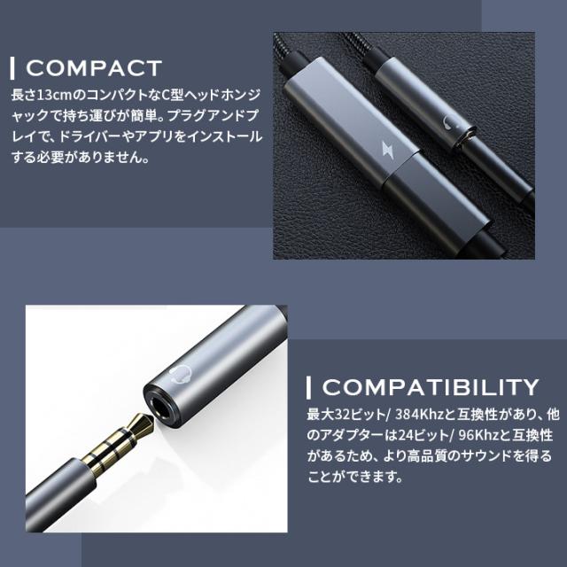 【持ち運びに便利】長さ13cmのコンパクトなC型ヘッドホンジャックで持ち運びが簡単。プラグアンドプレイで、ドライバーやアプリをインストールする必要がありません。このコンパクトなusb-c-auxアダプターは最大32ビット/ 384Khzと互換性があり、他のアダプターは24ビット/ 96Khzと互換性があるため、より高品質のサウンドを得ることができます。