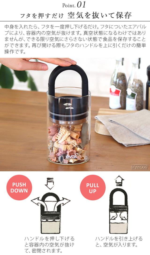 フタについたエアバルブにより、フタを押し下げるだけで容器内の空気を抜いて密閉することができます。再び開ける際もフタのハンドルを上に引くだけのシンプル操作。食べ物が空気にさらされる時間が長いほど鮮度や風味が早く失われるため、コーヒー豆や紅茶、ドライフルーツ、グラノーラ、パスタ、ハーブなどの保存に最適です。