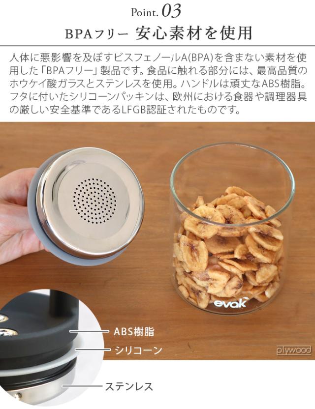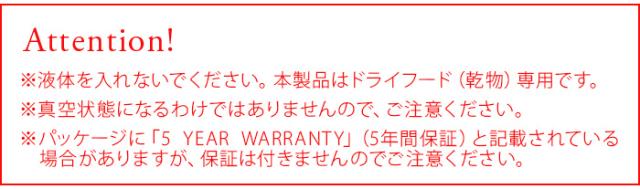 | 液体を入れないでください。本製品はドライフード(乾物)専用です。 真空状態になるわけではありませんので、ご注意ください。 パッケージに「5 YEAR WARRANTY」(5年間保証)と記載されている場合がありますが、保証は付きませんのでご注意ください。 |