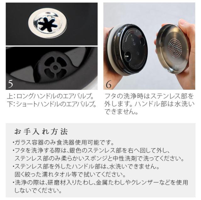| ガラス容器のみ食洗器使用可能です。 フタを洗浄する際は、銀色のステンレス部を右へ回して外し、ステンレス部のみ柔らかいスポンジと中性洗剤で洗ってください。 ステンレス部を外したハンドル部は、水洗いできません。固く絞った濡れタオル等で拭いてください。 洗浄の際は、研磨材入りたわし、金属たわしやクレンザーなどを使用しないでください。 |