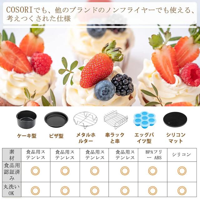 COSORIノンフライヤーアクセサリーは安全な食品グレードでかつ耐熱、しかもBPAフリー材料で作られたので、有害な化学物質の心配がなく、健康的な料理をお楽しみいただけます。