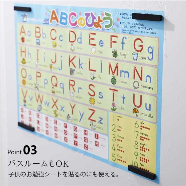 バスルームで子供のお勉強シートを貼るのにも使えます。