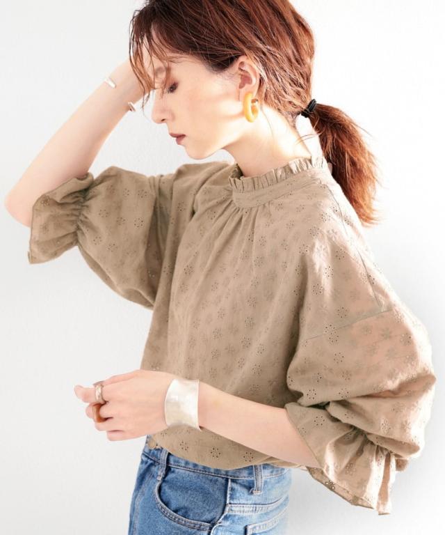 ボリューム袖とドロップショルダーのシルエットが女性らしい雰囲気に。