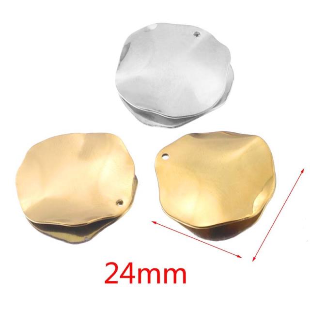 丸型のプレートを緩やかに波打たせた少し大きめのDIYできるようにチャーム用の丸穴を開けたステンレス製のクラフトパーツ。