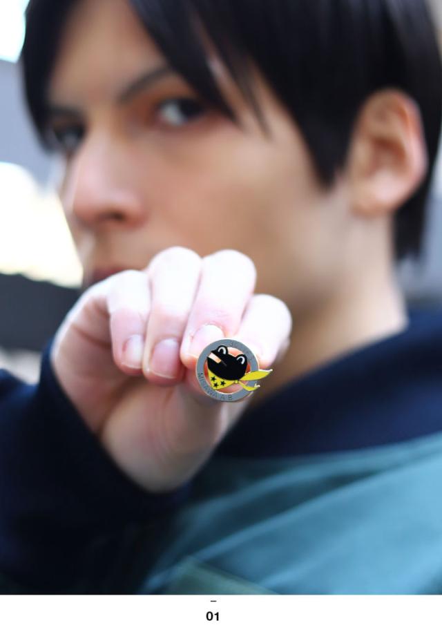 カエル部分に七宝風の型抜きプレス加工を施し、ハイビジュアル(高視認性)の塗装とゴールドの縁取りで仕上げたスペシャル感漂う高度な仕上がり。