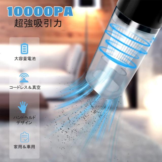 【動力抜群&超強吸引力】定格パワーが約120wの強力モーターが搭載されており、最大10000pa以上の吸引力で、 髪の毛、ペットの抜け毛や、ハウスダスト、花粉、パソコンキーボードのほこり、紙屑、おやつカス、タバコ殻、車内の砂や埃等のゴミをしっかり吸い込みます。この一台のハンディクリーナーで効率よく掃除することが可能になります。