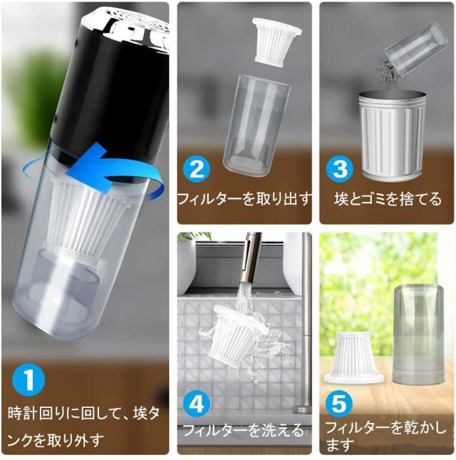 【低騒音&洗えるフィルター&コードレス】1、日常的な掃除作業に役に立つークリーナーは、低騒音で、稼働時の騒音は約85db、子供やペットの休みの邪魔にはなりません。2、洗えるフィルター、汚れたら、水で綺麗に洗えます、ただし、洗えたら、完全に乾いてから使用してください。3、USBケーブルでさまざまな場所で充電できます(使用中に充電する必要がない)、とても便利です。4、コードレス設計で邪魔にならず。5、逆流防止弁が付いて、掃除中に中からゴミが落ちることが心配必要ありません。