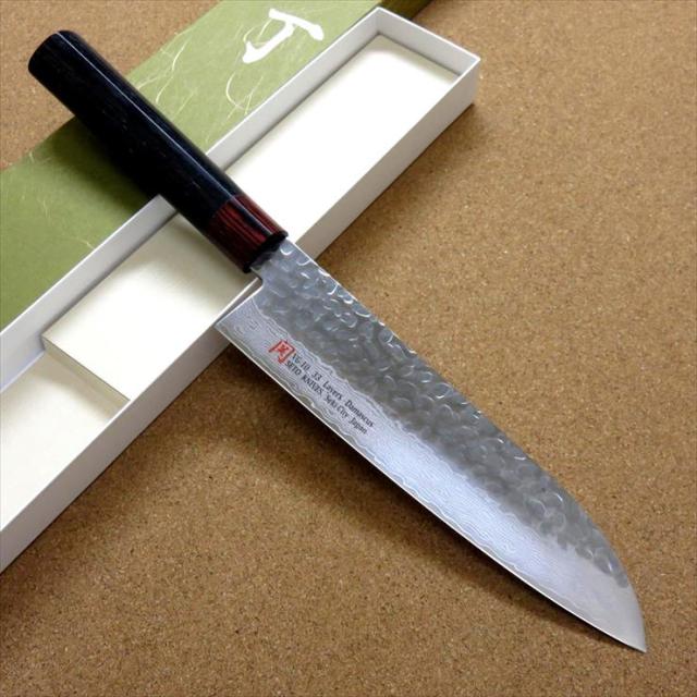 メーカー:瀬戸カトラリー ブランド:伊勢屋 アイテム名:三徳包丁 数量:1本 製造元:岐阜県関市 サイズ 全長:約310mm 刃部:約180mm 刃幅(刃元部):約44mm 刃厚(峰刃元部):約2.4mm 重量:約155g 材質 刃部:鍛錬 VG10 ニッケルダマスカス鋼 33層 硬度:58前後 柄部:黒パッカー |