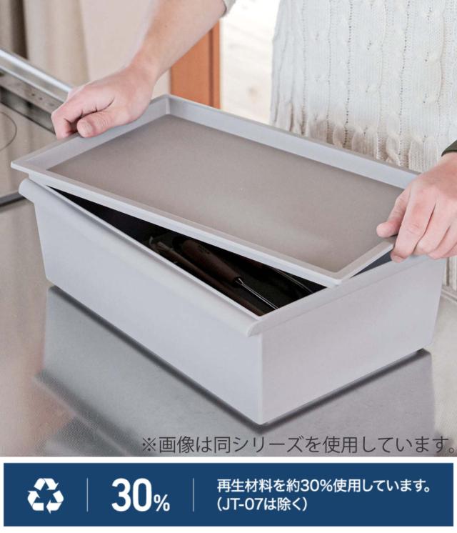素材には、使用済み製品及び製造工程から出る廃棄物を回収し再び材料や原料として利用した再生材料を30%使用しています。機能性だけでなく、環境にも配慮して作られております。また、汚れや水に強いプラスチック製なので、湿気の多い洗面脱衣所、汚れやすいキッチンや玄関まわり、ゴミ箱やおもちゃ入れにも安心してお使いいただけます。