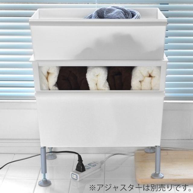 | 取り出しやすい引手 前面・後面ともに引手があります。奥まった場所や高い場所に置いても、取り出しやすいです。 ※引手の奥行:約1.5cm | 複雑な段差もクリア アジャスター(別売り)を取り付けることで、下にコードや排水栓をまたいだり、段差のある場所にも置いていただくことができます。脚は1本ずつ高さ10cm〜12.5cmでの調節が可能です。 ※付属のキャスターと併用できません。 |