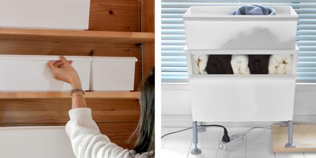 収納例:上段にドライヤー、衣類など/下段にタオル