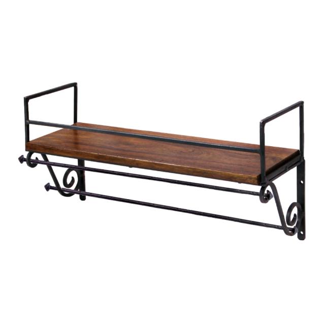 木目の美しいこちらは、見た目もこだわりたい方におすすめなウォールラックです。収納物の落下防止にもなる、職人の手で鉄を叩いて製造されたロートアイアンのバーも魅力。取り外しできる2本のバーには、タオルやS字フックを掛けることができるので、キッチンや洗面所でも大活躍間違いなしです。4か所のネジ穴から壁に取り付けできます。