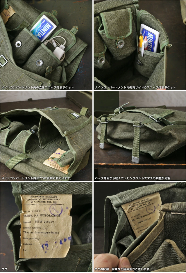 | 商品説明 | 実物 新品 デッドストック ポーランド軍 ブレッドバッグ / ショルダーバッグのご紹介です。 ポーランド軍で実際に使用されていた、ショルダーストラップ付のブレッドバッグ。 ブレッドバッグとは、元々兵士が身の回りの日常品を入れておくためのバッグとして使われていたもので、内部には仕切りと多数のポケットがり、コンパクトでスッキリした見た目に反して非常に収納力があります。 素材は目が粗くザラザラとした肌触りが特徴的なキャンバス地を使用。バッグの上部には持ち手が付いており、ショルダーストラップもあるので、手提げと斜め掛けの2WAYで使用可能です。 丈夫かつシンプルなデザインはデイリーに取り入れたくなるアイテムです。 |