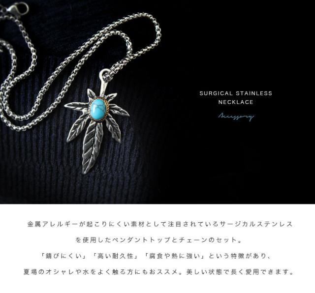 メイプルリーフをモチーフにイミテーションターコイズとブラスの装飾を施したペンダントトップ。金属アレルギーが起こりにくい素材として注目されているサージカルステンレスを使用したペンダントトップとチェーンのセット。「錆びにくい」「高い耐久性」「腐食や熱に強い」という特徴があり、夏場のオシャレや水をよく触る方にもオススメ。美しい状態で長く愛用できます。