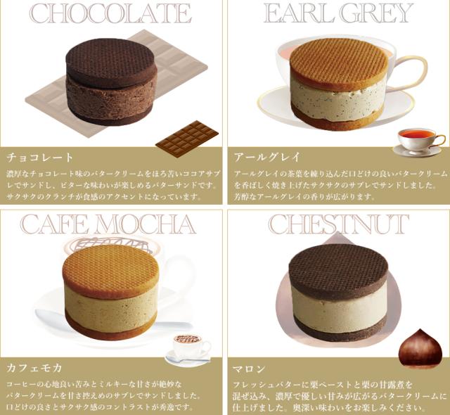 フレッシュバターの口どけの良いクリームにドライフルーツなどを混ぜ込み、香ばしく焼き上げたサブレでサンドしました。