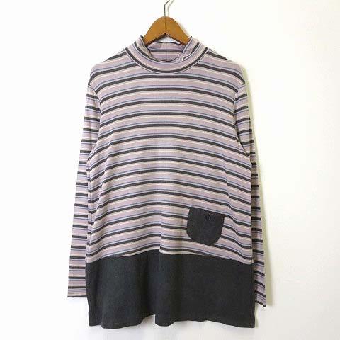 【中古】Febrero カットソー ハイネック ストレッチ 薄手 ボーダー 長袖 L 40 くすみピンク グレー レディース