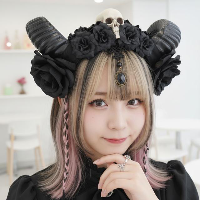 送料無料 カチューシャ 羊 角 山羊 ドクロ 髑髏 骸骨 スカル 悪魔 コスプレ ハロウィン レース バフォメット 黒魔術