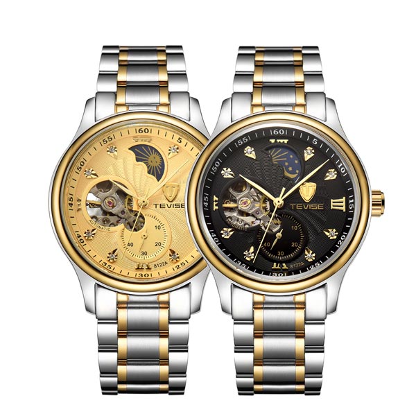 送料無料 ムーンフェイズ 自動巻き 腕時計 クロノグラフ 1分計 シースルー ジュエリーインデックス スケルトン メンズウォッチ メンズ腕時計 ステンレスベルト アレルギーフリー 金属アレルギー対応 かっこいい ブラック ゴールド