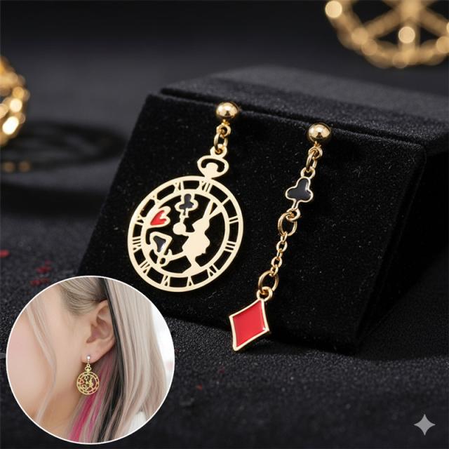 送料無料 両耳用 トランプ柄 うさぎ 時計 ピアス フラワー ラビット レディース キュート アリス スペード ハ?ト