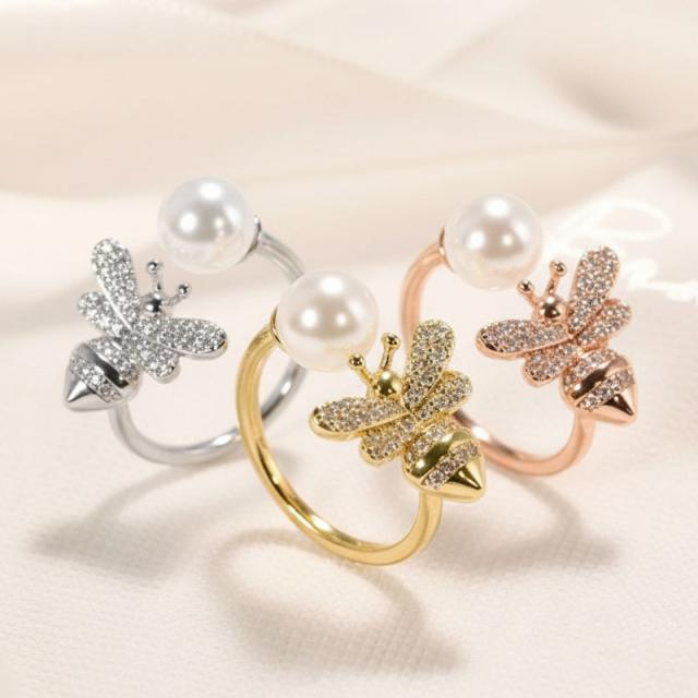 送料無料 指輪 リング 蜂 ミツバチ ハニビー 昆虫 パール 真珠 パヴェ ジルコン ジュエリー 宝石 レディースリング ギフト プレゼント