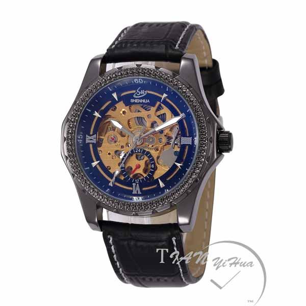 送料無料 2色選択可 高級ブルーレンズ 重厚ベゼルデザイン ブルーレンズスケルトン設計 キラキラベゼル 高級自動巻き腕時計