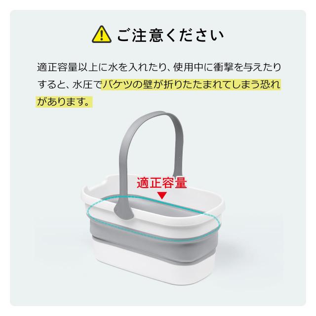 ※適正容量以上に水を入れたり、使用中に衝撃を与えたりすると、水圧でバケツの壁が折りたたまれてしまう恐れがあります。