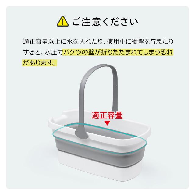 ※適正容量以上に水を入れたり、使用中に衝撃を与えたりすると、水圧でバケツの壁が折りたたまれてしまう恐れがあります。