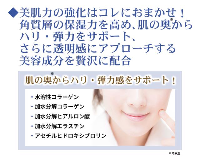 水、グリセリン、BG、(PEG−240/デシルテトラデセス−20/HDI)コポリマー、加水分解ヒアルロン酸、水溶性コラーゲン、加水分解コラーゲン、サクシノイルアテロコラーゲン、アスタキサンチン、ユビキノン、セラミドNG、セラミドNP、セラミドAP、ヒアルロン酸Na、アセチルヒアルロン酸Na、ローヤルゼリーエキス、イソステアリン酸フィトステリル、スクワラン、アラニン、アルギニン、グルタミン酸、トレオニン、セリン、プロリン、リシンHCl、グリシン、ヒドロキシエチルウレア、ジグリセリン、ペンチレングリコール、PEG−30水添ヒマシ油、PEG−60水添ヒマシ油、ミリスチン酸ポリグリセリル−10、カプリル酸PG、ペンタステアリン酸ポリグリセリル−10、ステアロイルラクチレートNa、ベヘニルアルコール、チオクト酸、オレイン酸ポリグリセリル−10、ステアリン酸ポリグリセリル−10、トリ(カプリル/カプリン酸)グリセリル、エタノール、リゾレシチン、フェノキシエタノール、カニナバラ果実油