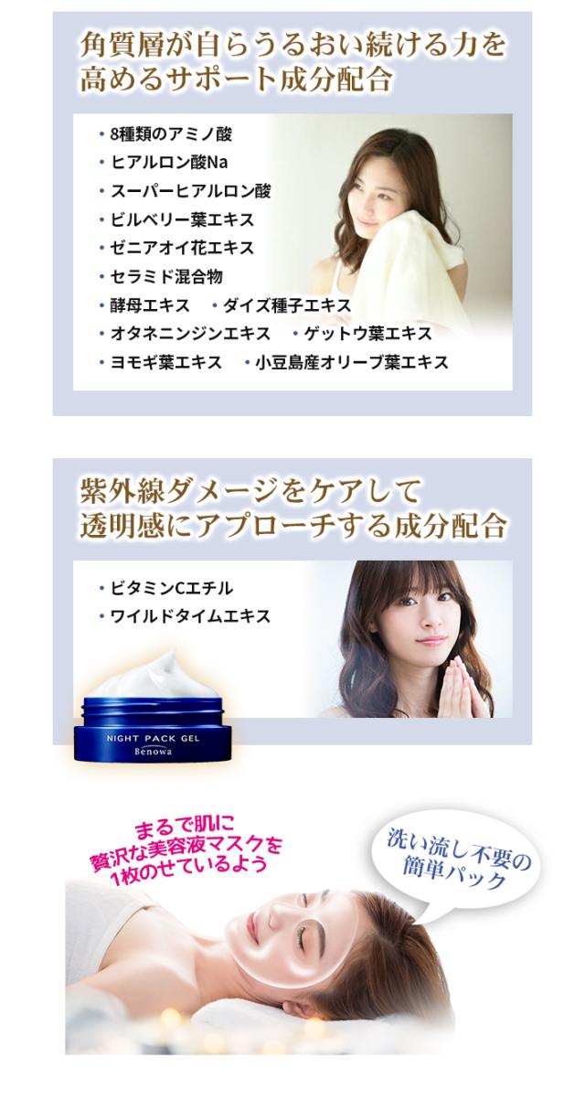 【ビノワ パーフェクトナイトパックジェルR】 全成分表示:水、BG、グリセリン、スクワラン、トリ(カプリル酸/カプリン酸)グリセリル、ベヘニルアルコール、ペンチレングリコール、マカデミアナッツ脂肪酸フィトステリル、ヒアルロン酸Na、アセチルヒドロキシプロリン、リン酸アスコルビルMg、パルミトイルペンタペプチド−4、水添レシチン、フィトステロールズ、ベタイン、PCA−Na、PCA、セリン、アラニン、グリシン、グルタミン酸、リシンHCl、トレオニン、アルギニン、プロリン、セラミドEOP、セラミドNP、セラミドAP、フィトスフィンゴシン、コレステロール、3−O−エチルアスコルビン酸、アセチルヒアルロン酸Na、セイヨウイラクサ葉エキス、加水分解エラスチン、ラウロイルグルタミン酸ジ(フィトステリル/オクチルドデシル)、オウゴン根エキス、ビルベリー葉エキス、ワイルドタイムエキス、ゼニアオイ花エキス、加水分解ヒアルロン酸、加水分解コラーゲン、ダイズ種子エキス、水溶性コラーゲン、アルゲエキス、メマツヨイグサ種子エキス、レイシ柄エキス、カンゾウ葉エキス、ゲットウ葉エキス、カンゾウ根エキス、サッカロミセスセレビシアエエキス、オタネニンジン根エキス、ローヤルゼリーエキス、ヨモギ葉エキス、オリーブ葉エキス、カルボマー、ヒドロキシエチルセルロース、キサンタンガム、水酸化K、ジメチコン、メタリン酸Na、トコフェロール、ラウロイルラクチレートNa、ポリソルベート20(小麦)、フェノキシエタノール 製造販売元:株式会社東陽化学研究所