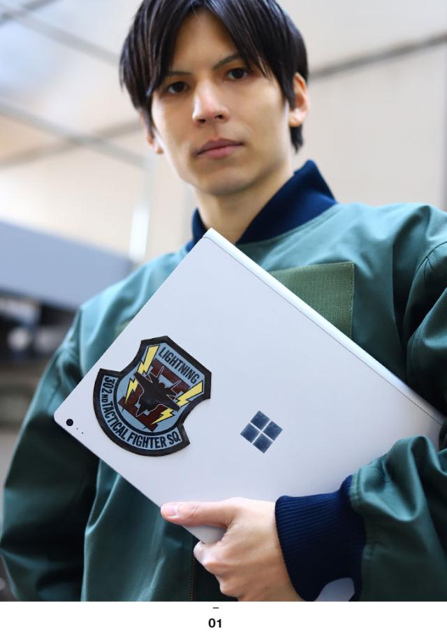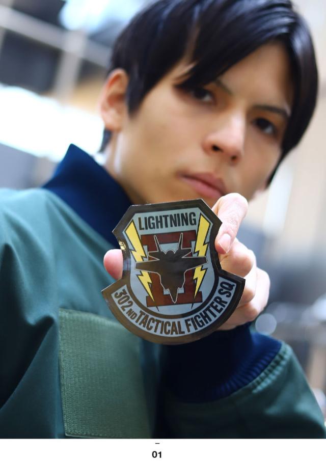 部隊マーク (エンブレム)は、F-35戦闘機のシルエットデザインを中央に配置し、両サイドの稲妻とローマ数字の2で「ライトニング 2」を表しています。隊員さんが右胸に付けているメインパッチのデザインです。