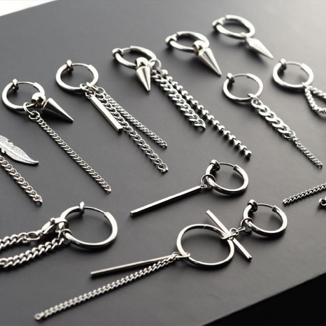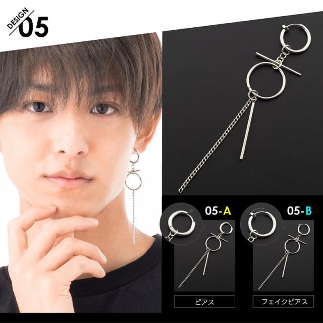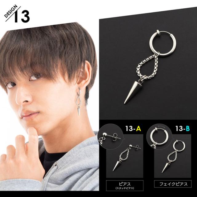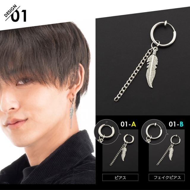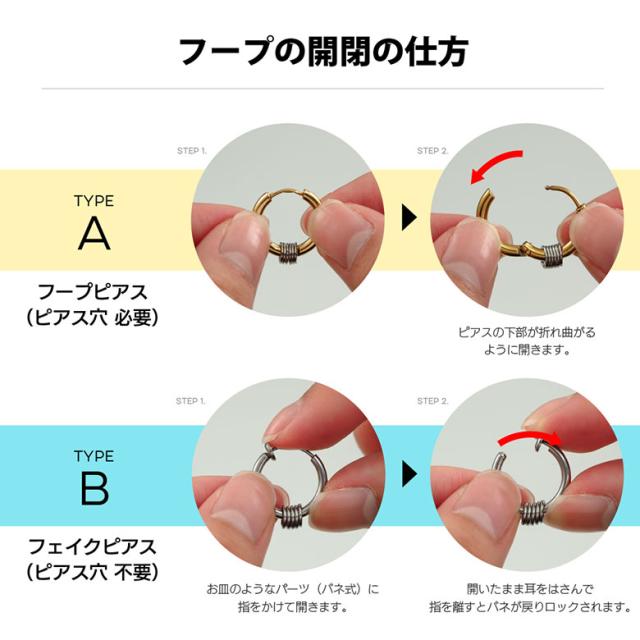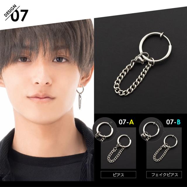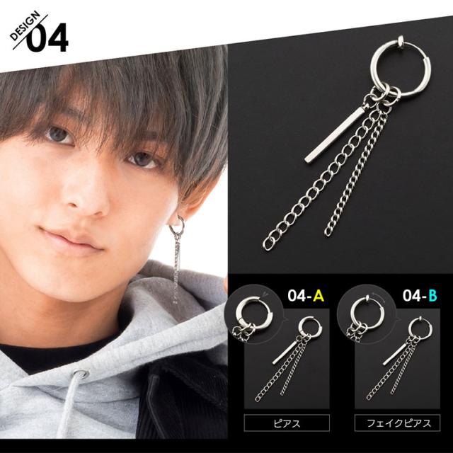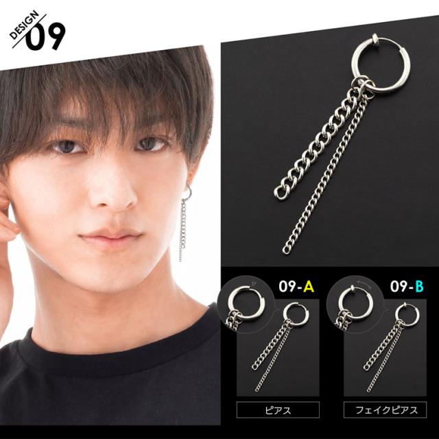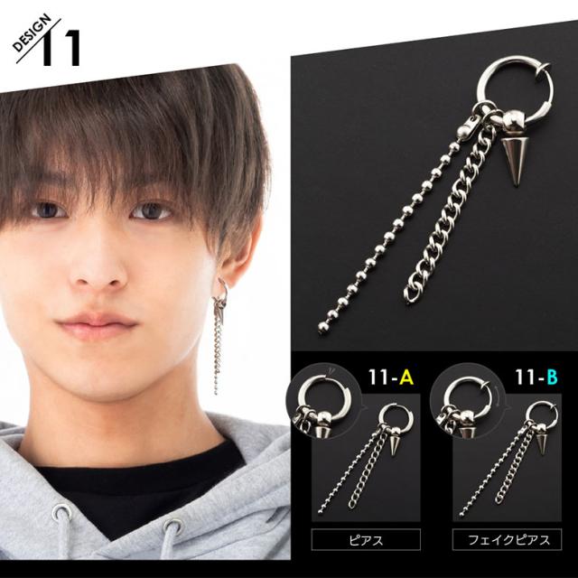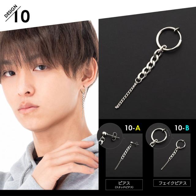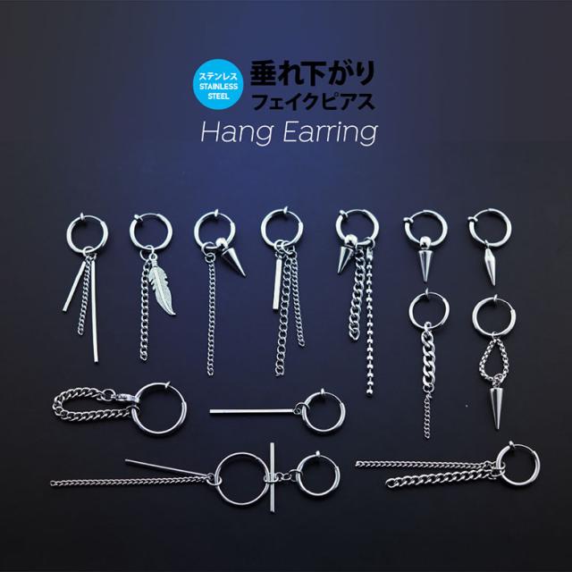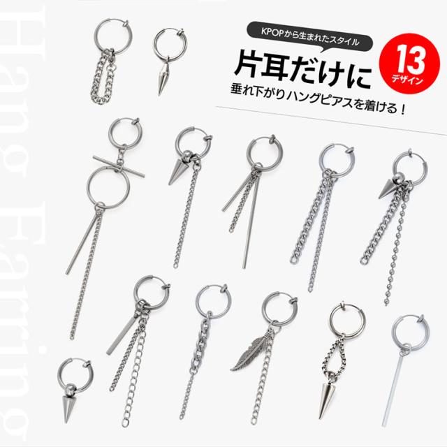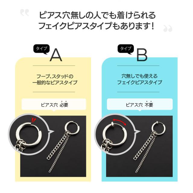 フープピアスに垂れ下がりのチェーンやチャームが付いたデザインのステンレス製ピアスです。韓国のK-POPスタイルから生まれた片耳に長めの垂れ下がりピアスを着けるスタイルのピアスで、日本でも認知度が上がり、シンプルな服装にプラスするとしっかりとしたアクセントで顔回りが引き立ちます。通常のピアス穴が必要なフープピアス(タイプA)と、ピアス穴無しでも着けられるフェイクピアス(タイプB)の2種類のタイプがあります。ご購入時にご希望のタイプを選択してください。また、ステンレス製なので変色しにくく傷もつきにくいので、金属アレルギーの心配も少なく、長時間のつけっぱなしもOKのピアスです。(※片耳用売りの価格です。両耳用で購入される場合は、2回買い物カゴに入れて下さい。)