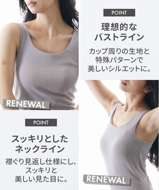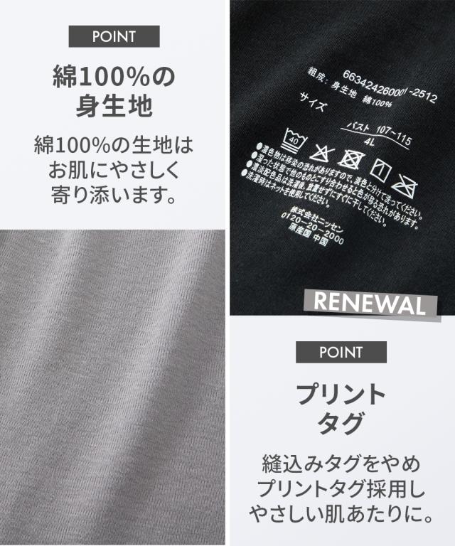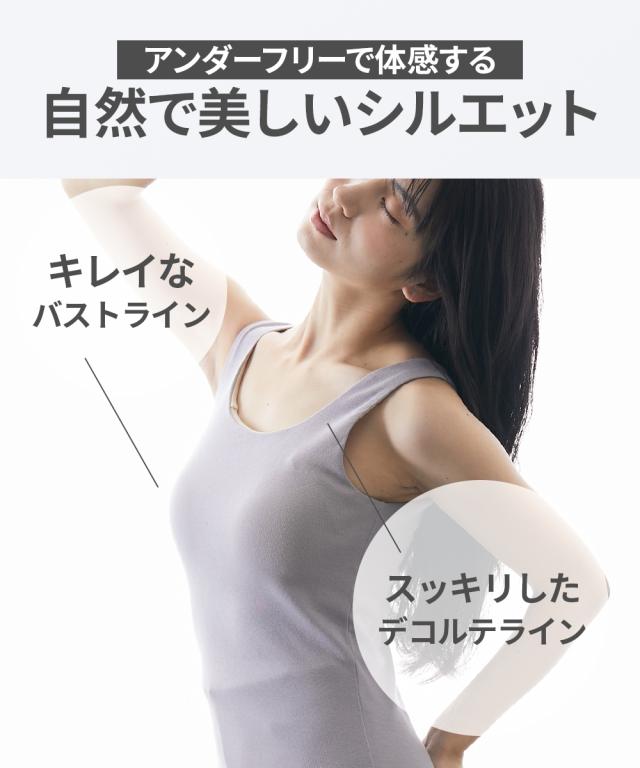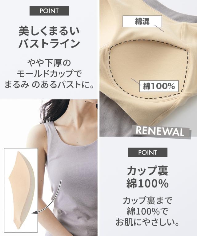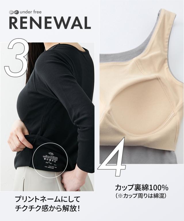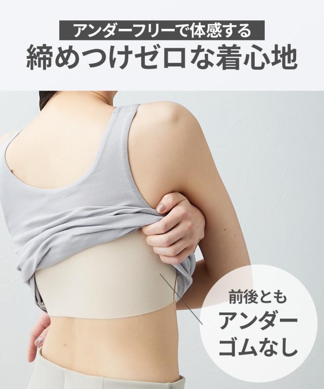 「締め付けゼロ」はそのままに。 もっと優しく、もっと美しく。 さらに進化した、新・アンダーフリー体験へ。 締め付けない、ストレスフリー、綿100%のやさしい着心地はそのまま、スッキリとした見た目と着用時のバストラインの美しさをさらに追求しました。 【見た目スッキリ】 パイピングをなくし、フラットな「見返し仕様」へ。服に響かず、洗練された印象に。 【理想のバストライン】 カップのパターンを一新。ノンワイヤーでも、自然で美しいバストラインをキープします。 【綿100へのこだわり】 綿100%の身生地だけでなく、カップ裏も綿100%に。さらに優しさを追求しました。※バスト周りの生地(綿65%・ポリウレタン35%)は除く 【肌ストレスフリー】 チクチクするタグをなくし、プリント仕様に。肌への刺激を極限まで減らしました。 楽なだけじゃなく、バストラインも美しく整える、さらに進化したアンダーフリー、ぜひ体験してください。 締め付けない、キレイ魅えのブラトップ 【アンダーフリー】 ニッセンだけの特別なブラトップです。人気の秘訣は、カップ部分の生地全体でバストを支える構造にあります。ブラトップの標準的な仕様であるアンダー部分のゴムを取り除き、伸縮性の高い