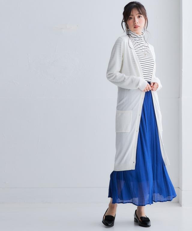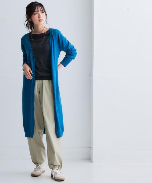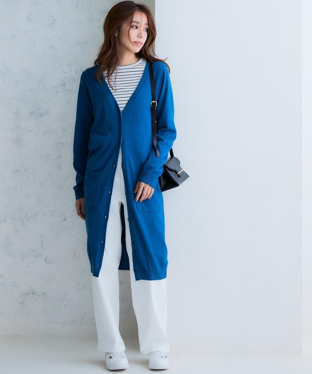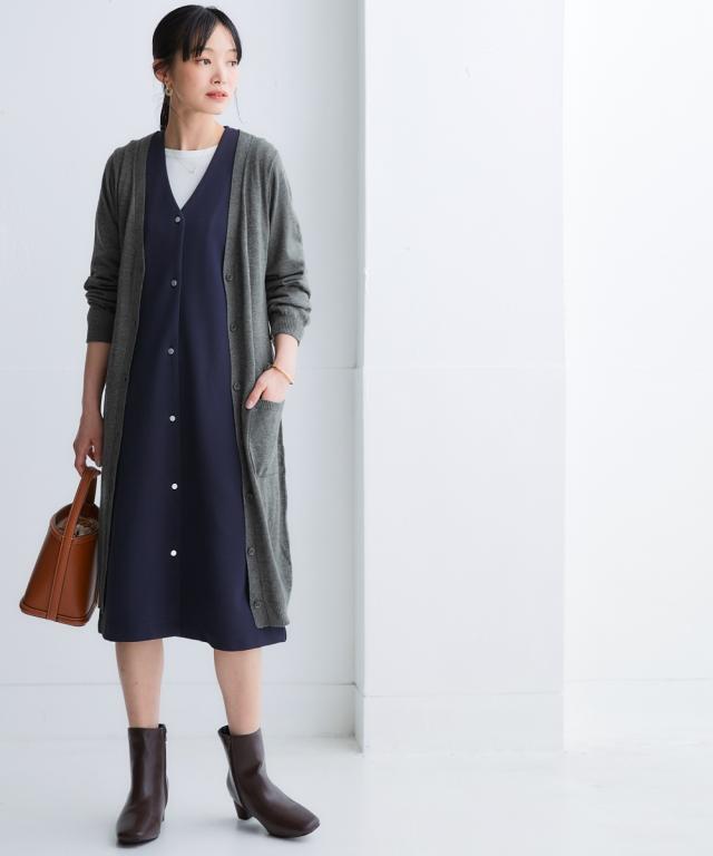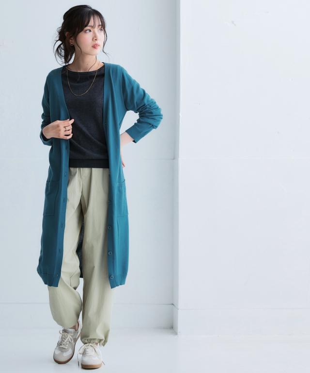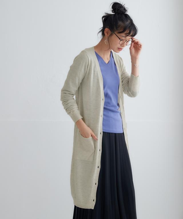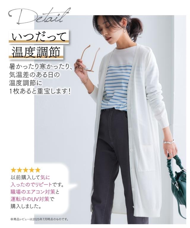 ニッセン人気商品!あると便利な【UVカット】シンプルVネックロング丈ニットカーディガンに待望の新色登場。 お客様の声にお応えして身生地同色ボタンにしました。