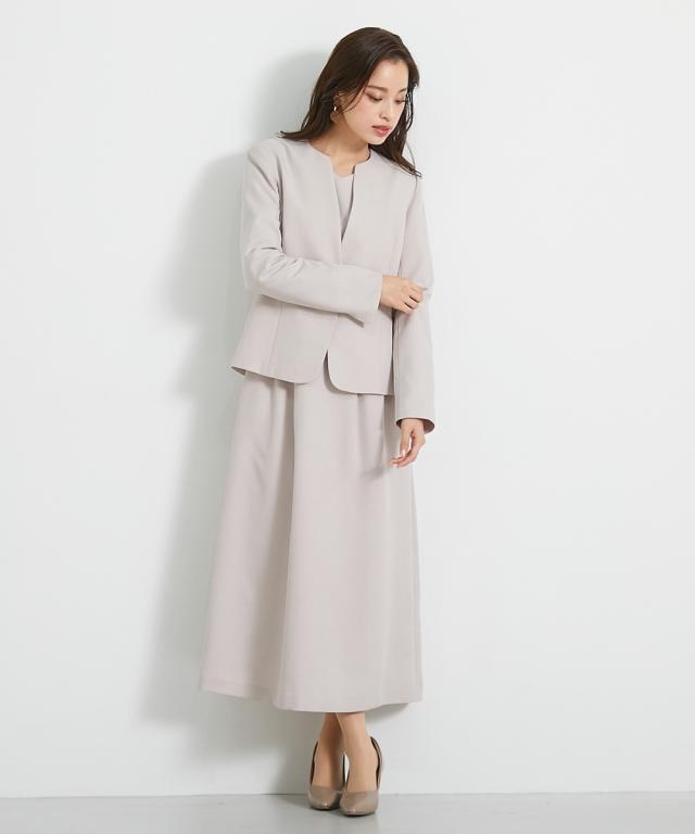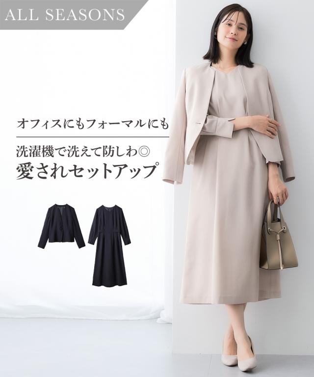 ◆ハレの日にもぴったり!格調高く装えるジャケット+ワンピースのアンサンブルスーツ◆ デコルテをきれいに見せるキーネックジャケットに、上品なロング丈ワンピースのセットアップは 通勤やお仕事服として、フォーマルな装いとして、単品使いでのカジュアルな着こなしなどもOK! いろいろな着回しで、上質セットアップスーツをせひお楽しみください!! ☆ワンランク上のこだわり☆◆デザイン 首元をきれいに見せる衿開きにこだわった、キーネックジャケット。 シンプルながらも、袖を通すときれいなシルエットを実感いただけると思います。 同素材のくるみボタンにすることで、フォーマル感もアップ☆ ワンピースの衿元のVネックはジャケットとの衿開きのバランスにこだわって設定しています♪ 後ろファスナー開き&後ろウエストゴム入りできれい見えなのに着脱・着心地もラクチンです。 ウエスト部両側に飾りベルトをあしらうことで、苦しくないのにウエストマーク効果も◎ 上品なロング丈でこっそり気になる部分もカバーOKです☆◆素材 春から初夏、初秋から秋にかけて着ていただくのにぴったりな 中肉の厚みの、プレーンな表面感のさらりとした手触りの素材です。 ニュアンスカ