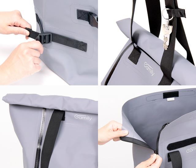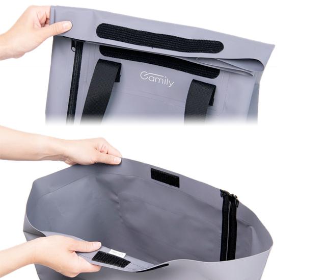 ・荷物の量に応じて調節できるロールトップタイプで、ロールアップしない時も内側のベルクロテープで荷物の落下を防止