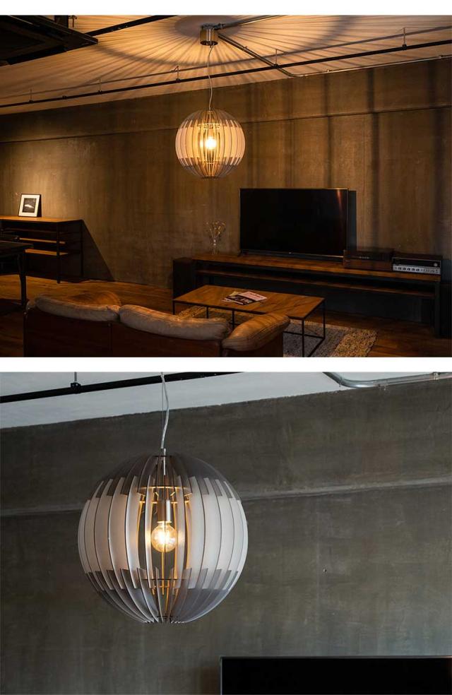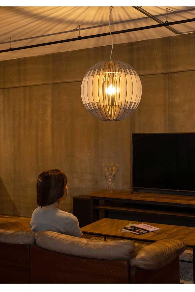 たくさんの木の羽根でつくられた球体はどこか宇宙的。落ち着いたグレーとホワイトのひとつひとつの羽根のあいだから放たれる光のアングルが、見たことのない美しい空間をリビングに作りだします。