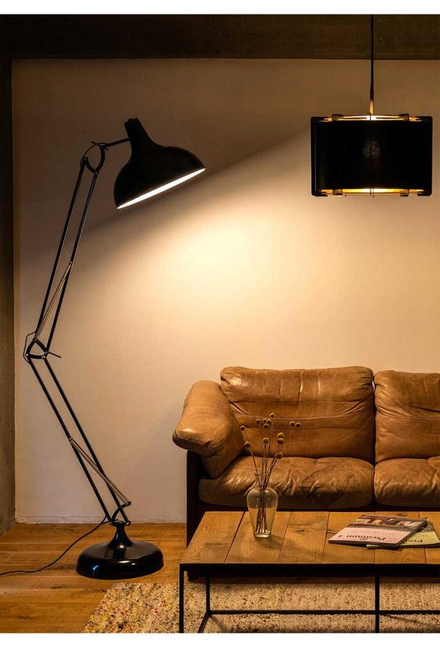 どこかで見たことのあるこのデスクランプ--に見えますよね。じつは高さが170cmもあるんです。これは1932年に発表された「アングルポイズ」というスプリング式のデスクランプを巨大化してフロアランプに仕立てあげています。