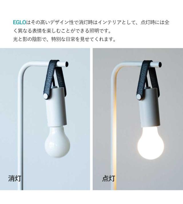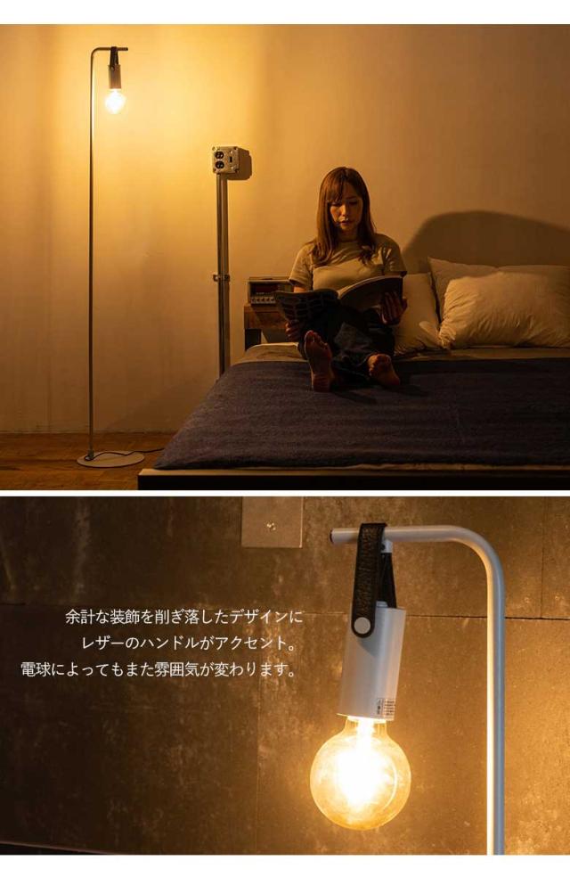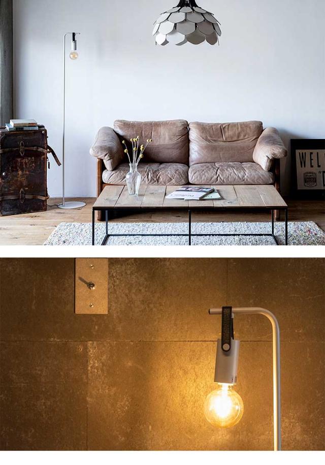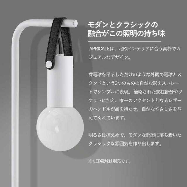 簡略された支柱部分やソケットにくわえ、唯一のアクセントとなるレザーのハンドルが品をもたせ自然なやさしさをあたえてくれています。北欧インテリアに合う素朴でカジュアルなデザインです。