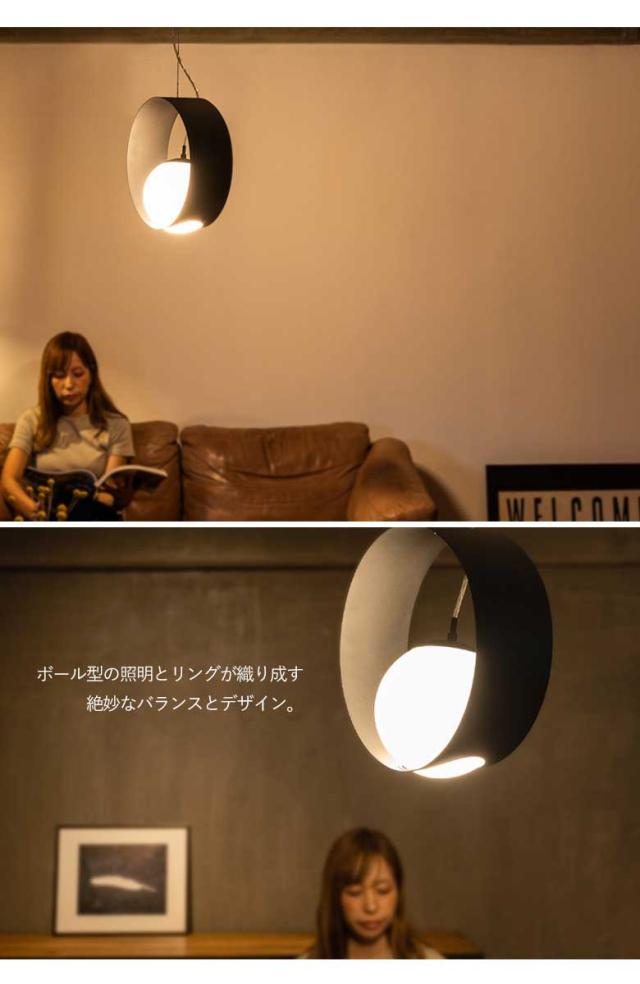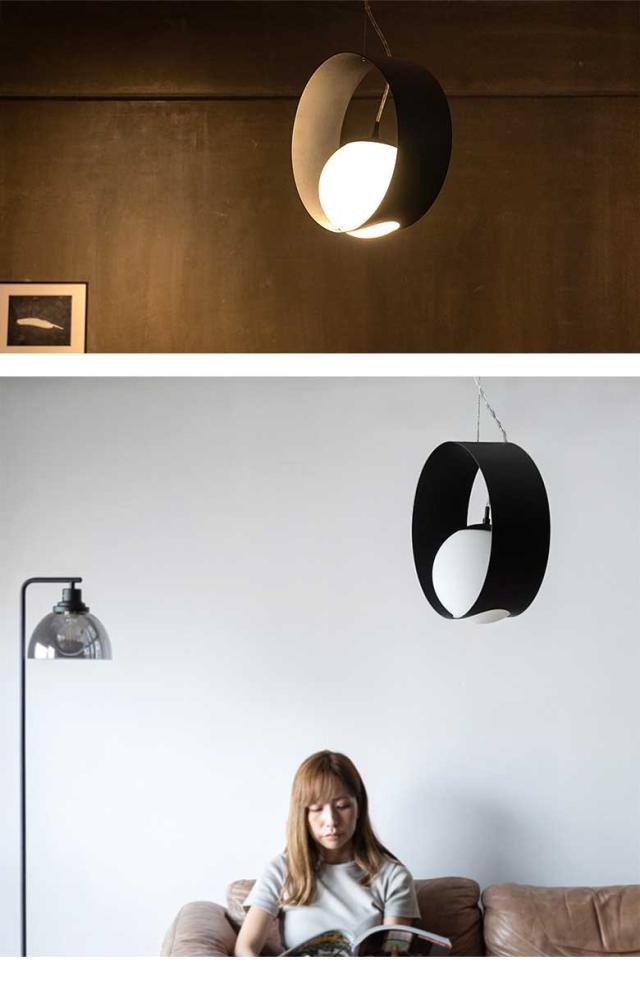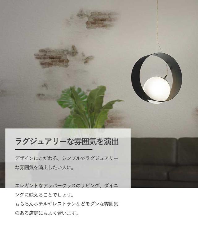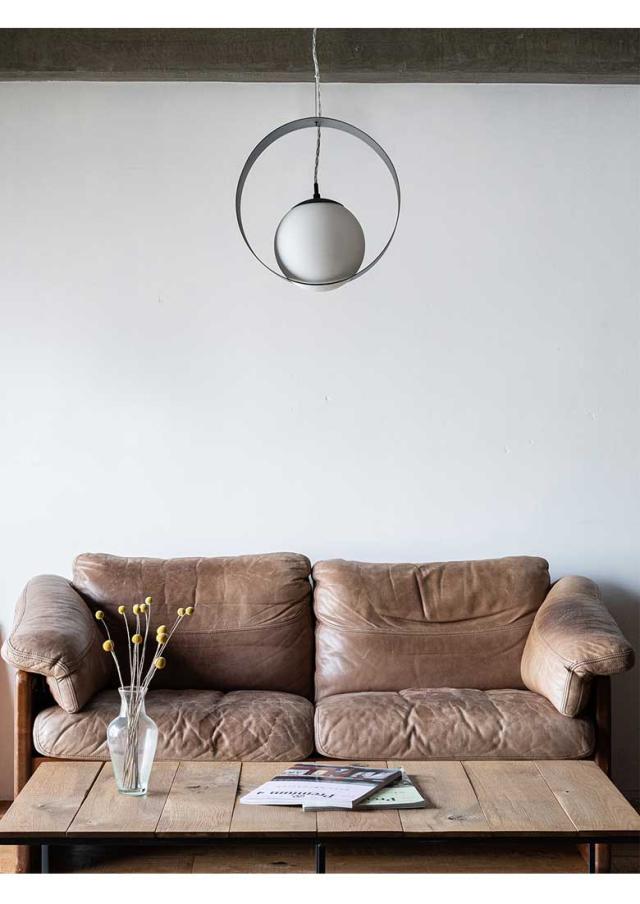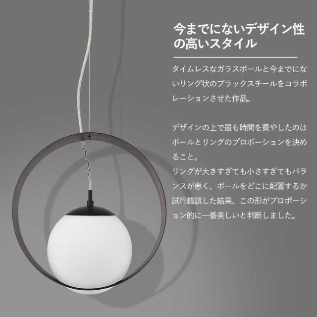 黒いメタルリングとミルキーホワイトのガラスボールがかもしだすモダンなデザインはまるで近代的な市街彫刻のようです。個性的な部屋のアクセントに最適でしょう。