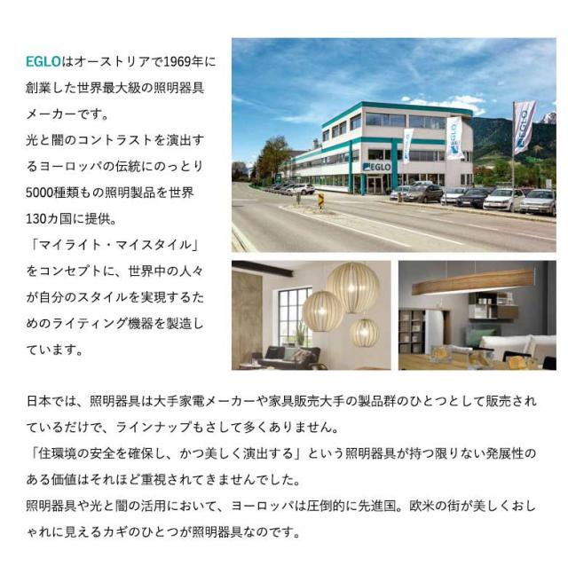 EGLOはオーストリアで1969年に創業した世界最大級の照明器具メーカーです。光と闇のコントラストを演出するヨーロッパの伝統にのっとり、多種多様な照明製品を世界130カ国に提供しています。