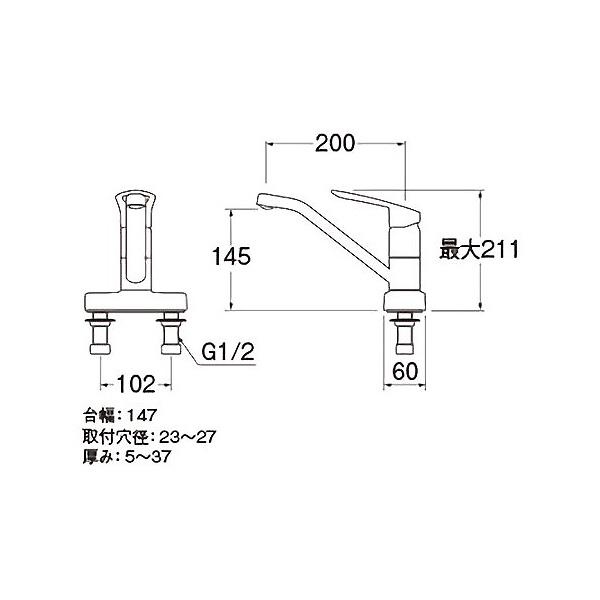 | 仕様・特長 | ●JIS品 ●ミニキッチン用 ●節水効果のある水栓です。 ●お湯の出ない位置が「カチッ」とわかる「エコ位置クリック」でスマートにお湯のムダづかいを防げます。 ●ハンドル、レバーに格段に使用感を向上させるクリック機構を採用しています。 ●吐水口120°回転 ●台幅:147mm ●取付穴径:23〜27mm ●取付可能天板厚:5〜37mm ●節湯:C1 ●カートリッジ:PU101-161XT |