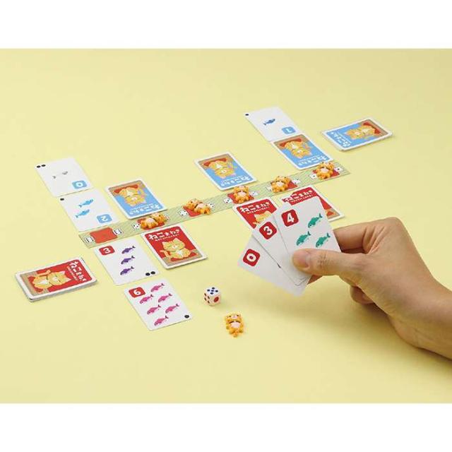 2人対戦ゲーム。ねこまねき。魚、かつおぶし、またたびでねこを招き寄せよう!魚をあげて猫を招き寄せるゲームです。猫はたくさん魚をくれる方に来てくれますが、魚はあげたい猫にあげられるとは限りません。かつおぶしやまたたびなどの大好物で気をひけるかも・・・。サイコロを振って出た番号の座布団に座った猫に、魚カードを出します。魚カード2枚の合計が大きいほうが猫を招き寄せられますが、相手がいくつの魚カードを出しているかは半分しかわかりません。●対象年齢:6歳〜●プレイ人数:2人●プレイ時間:約20分