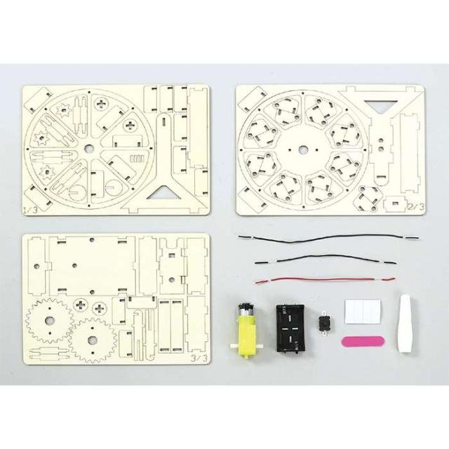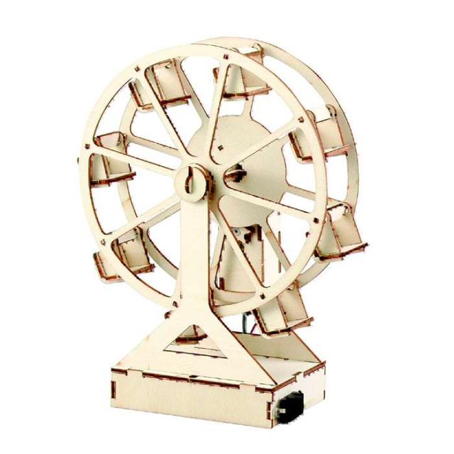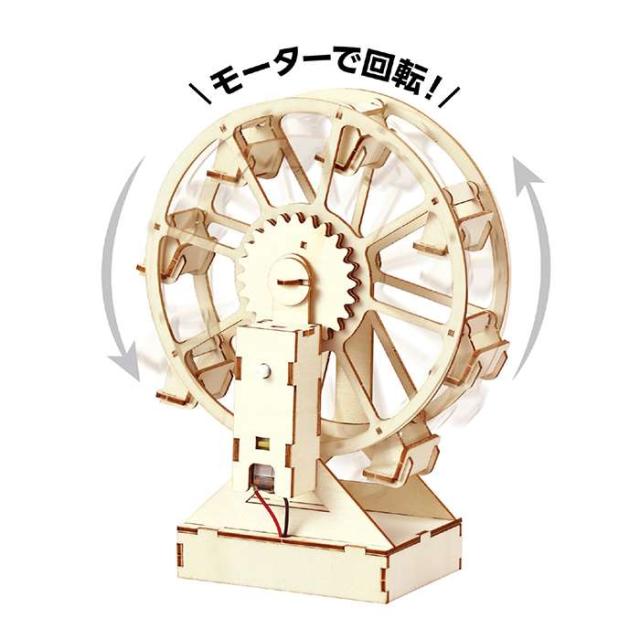 組み立てキット。モーターの力で回転する手づくり木製観覧車。パーツを外して組み立てるだけ。モーターで回転。単3電池x2本(別売)。