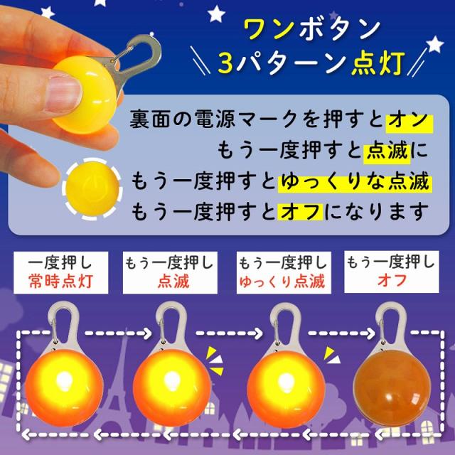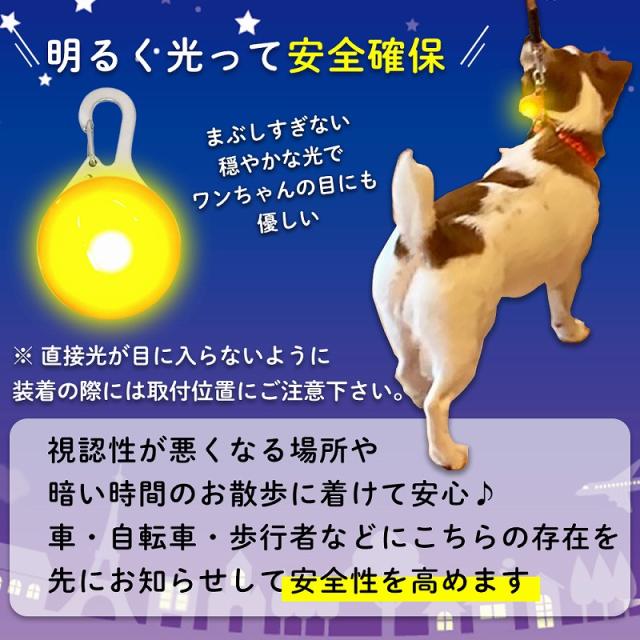 - これからの季節のわんちゃんのお散歩で夜が多くなるので購入しました。二匹いるので2個セットも魅力です!散歩中、わんちゃんも気にならないみたいで、サイズも良いし、明るさもいいです!あと同色2個セットもある...