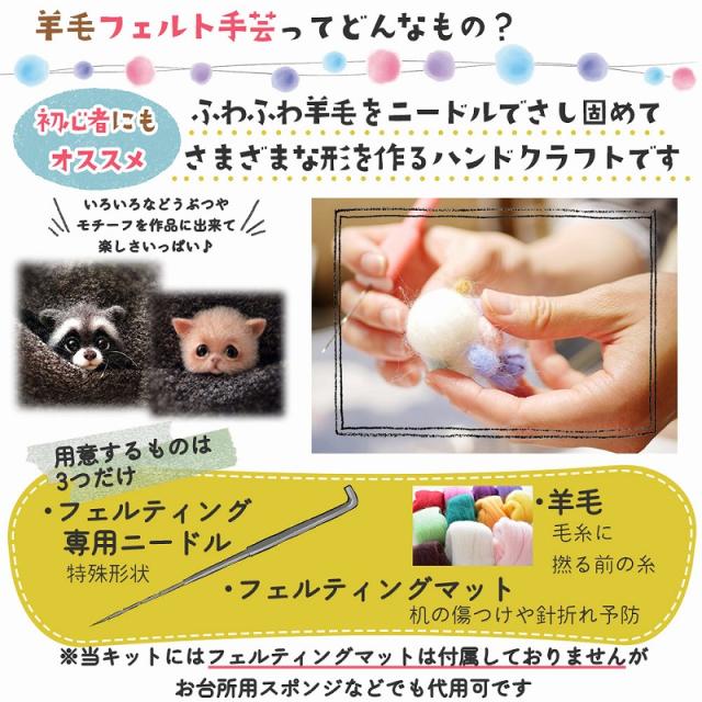 専用ニードルと羊毛、フェルティングマット(お台所スポンジ等でも代用できます)があればすぐに始められる手軽さも人気の秘密です。